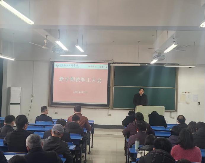 随后,学院召开新学期教职工大会。周世军对本科生毕业论文指导、期末考试、教学材料归档、新商科云实验中心建设等工作做了相关要求;吴金南就科研项目申报、学术交流、安徽省社科奖申报工作进行了交流;李伟军对研究生复试、硕士生导师遴选、同等学历研究招生等工作做了相关安排;张虎就班主任与导师工作、教风学风、学科竞赛指导、毕业生工作、校友联系等方面工作进行了交流。
