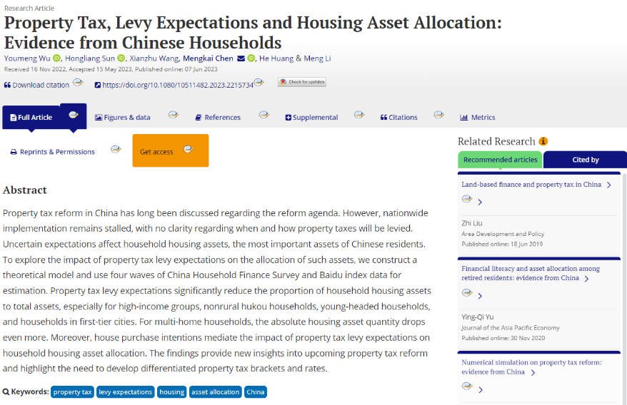 确保房地产市场平稳健康发展是稳经济的重要一环。过去十多年,中国房地产市场经历了房价快速上涨的繁荣时期,面对地方政府债务压力和房价上涨,中央政府有意开征个人房产税。然而,自2011年个人房产税在重庆和上海试点开征以来,中国其他地区的改革步伐一直停滞不前。住房是中国家庭资产中最重要的组成部分,占家庭总资产的59.1%。尽管房产税征收的不确定性对居民家庭资产配置的影响尚不清楚,但这是中国房产税改革的一个关键问题。