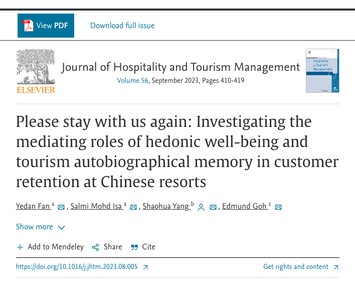 行为科学与政策协同交叉创新团队杨少华副教授,与马来西亚理工大学、澳洲邦德大学研究人员合作,揭示了旅游酒店顾客保留的微观心理规律,相关成果发表在《Journal of Hospitality and Tourism Management》(简称JHTM)。JHTM是澳大利亚旅游与旅游教育委员会的官方杂志,旅游与休闲管理学科的国际权威学术期刊。该期刊是SSCI一区最新影响因子为8.3,在ABDC国际期刊排名A类。后宫电影院