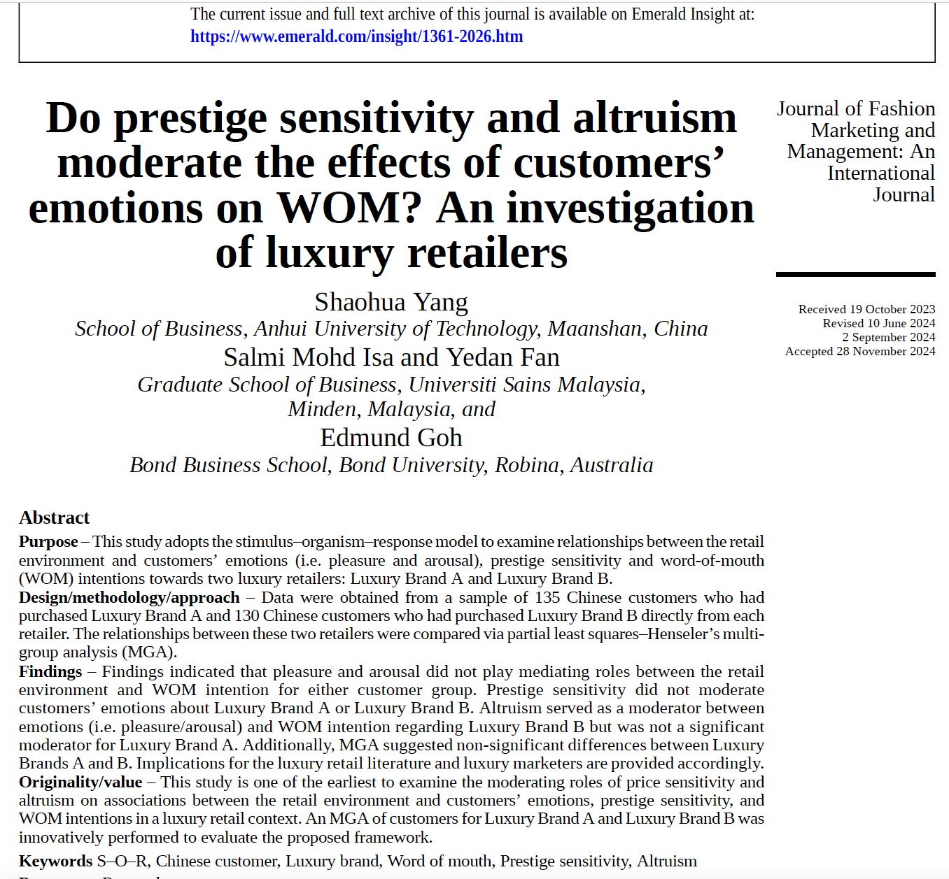 杨少华副教授以第一作者身份在国际知名期刊《Journal of Fashion Marketing and Management》(简称JFMM,中文名《时尚营销与管理杂志》)上发表了一篇题为《Do prestige sensitivity and altruism moderate the effects of customers’ emotions on WOM? An investigation of luxury retailers》的学术论文。合作作者包括马来西亚理科大学的樊烨丹博士和澳大利亚邦德大学的Edmund Goh教授,后宫电影院