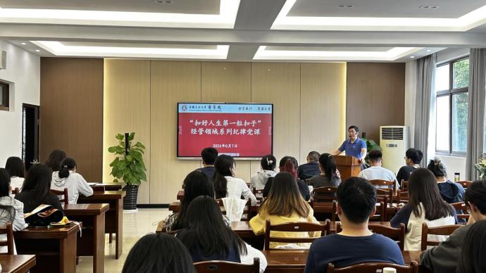 为深入学习贯彻习近平总书记关于“扣好人生第一粒扣子”的重要论述,进一步加强大学生党纪学习教育,学院近日举办了“扣好人生第一粒扣子”经管领域系列纪律党课活动。该系列活动旨在将党纪学习教育与学科专业相结合,有针对性地引导经管专业学生树立正确的价值观,强化纪律意识,为成为新时代高素质经管人才打下坚实基础。6月7日的党课由会计硕士党支部书记、会计系教师陈昌龙主讲。学生第一、第二、第九党支部和会计硕士党支部全体党员聆听党课。