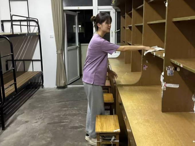 活动当天,同学们身着统一的志愿者服装,携带清理工具,按照事先分好的小组,迅速投入到紧张而有序的清扫工作中。有的负责擦拭门窗,清除灰尘;有的细心整理床铺,摆放生活用品;还有的则拿起扫帚和拖把,对地面进行彻底清扫。虽然天气炎热,但大家的脸上始终洋溢着笑容,汗水浸湿了衣衫,却丝毫没有减退他们服务的热情。大家心往一处想,劲往一处使,共同为迎接新生的到来贡献自己的力量。