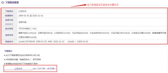 您将看到具体的条件设置信息,同时,下方显示查询数据的下载压缩包。点击压缩包名称,可直接下载数据到本机。注:下载数据仅保存48小时,您可以在后宫电影院【下载记录】模块找到历史下载信息。
