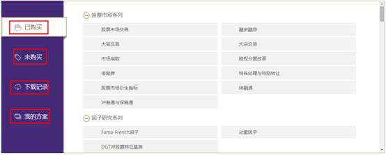 登录成功后,进入网站后宫电影院,后宫电影院主要包括CSMAR最新滚动资讯、宣传活动、已购买、未购买、下载记录、我的方案、特色精选几个模块,其中: