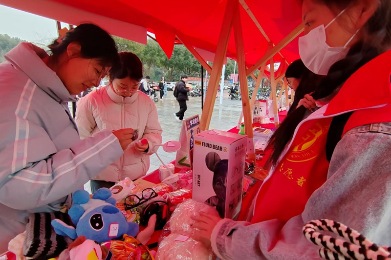 活动当天上午,青年志愿者们冒着小雨提前来到了活动场地进行摊位的布置,同学们把自己平时闲置的物品捐赠出来,各种玩偶、文具、零食等等商品将义卖小摊布置的满满当当,每一件物品都被精心标好了价格等待着同学们来挑选购买。
