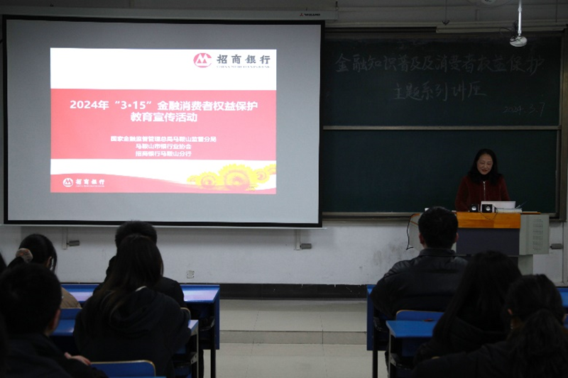于教D207举办金融知识普及及消费者权益保护主题系列讲座。国家金融监督管理总局马鞍山监管分局赵成泽,马鞍山市银行业协会董光丽,招商银行综合管理部总经理王蔷薇应邀作宣讲,各级学生代表参加本次讲座。讲座由副处级辅导员王琴主持。