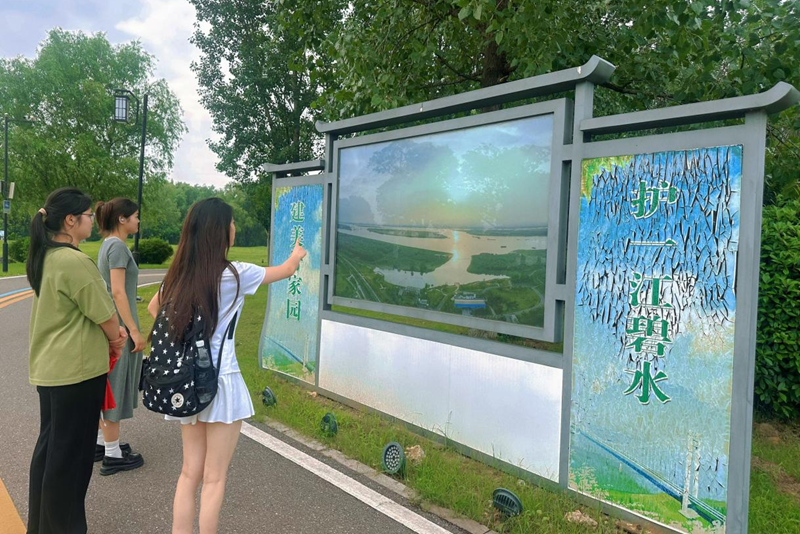 团队首站来到马鞍山薛家洼。这里曾因非法码头、固废堆积点以及“散乱污”企业的无序分布,环境状况堪忧。自 2019 年起,马鞍山市以薛家洼为切入点,按照环境整治、生态修复、水源地保护、防洪治理、景观提升 “五合一” 的科学思路,对长江东岸实施综合整治。拆除违建、帮助渔民上岸、大规模植树复绿等举措稳步推进,长江岸线实现了华丽转身。如今的薛家洼,江面波光粼粼,沿岸绿带环绕,已然成为市民休闲漫步的理想去处。“以前江边黑烟呛人,现在天天来散步,像住公园里!”附近居民王大爷的感慨,道出了环境蝶变的民生温度。同学们在走访过程中,与当地居民亲切交流,亲身体验到“绿水青山就是金山银山”的生动实践,对生态保护理念有了更为直观、深刻的理解。
